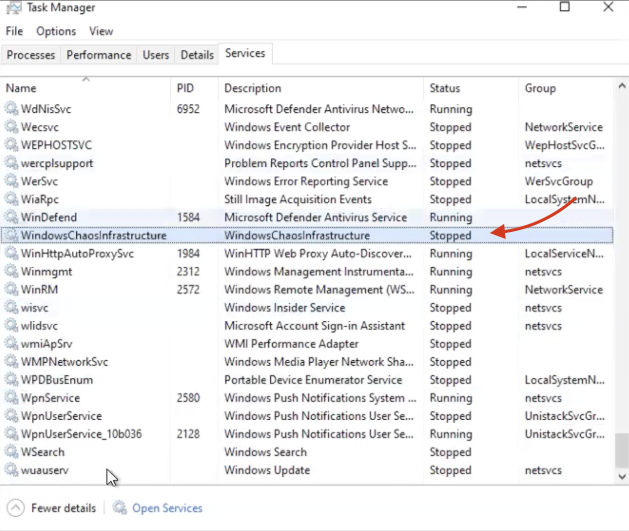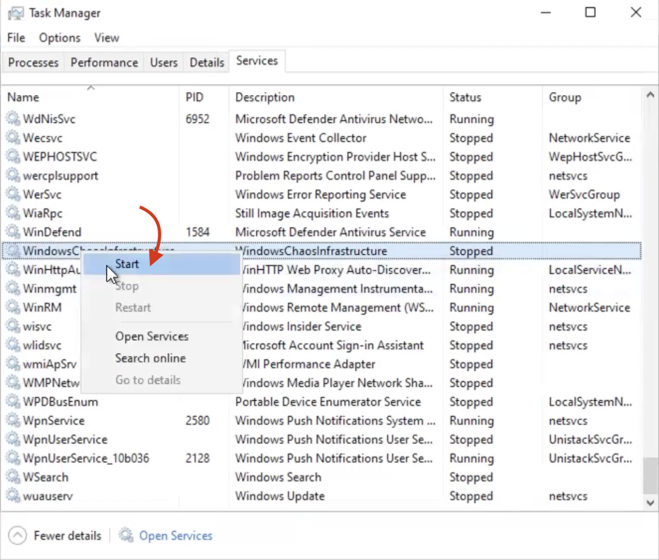To verify the status of the service, navigate to the command prompt on your Windows. Search for Task Manager, select More details and check the status of WindowsChaosInfrastructure.