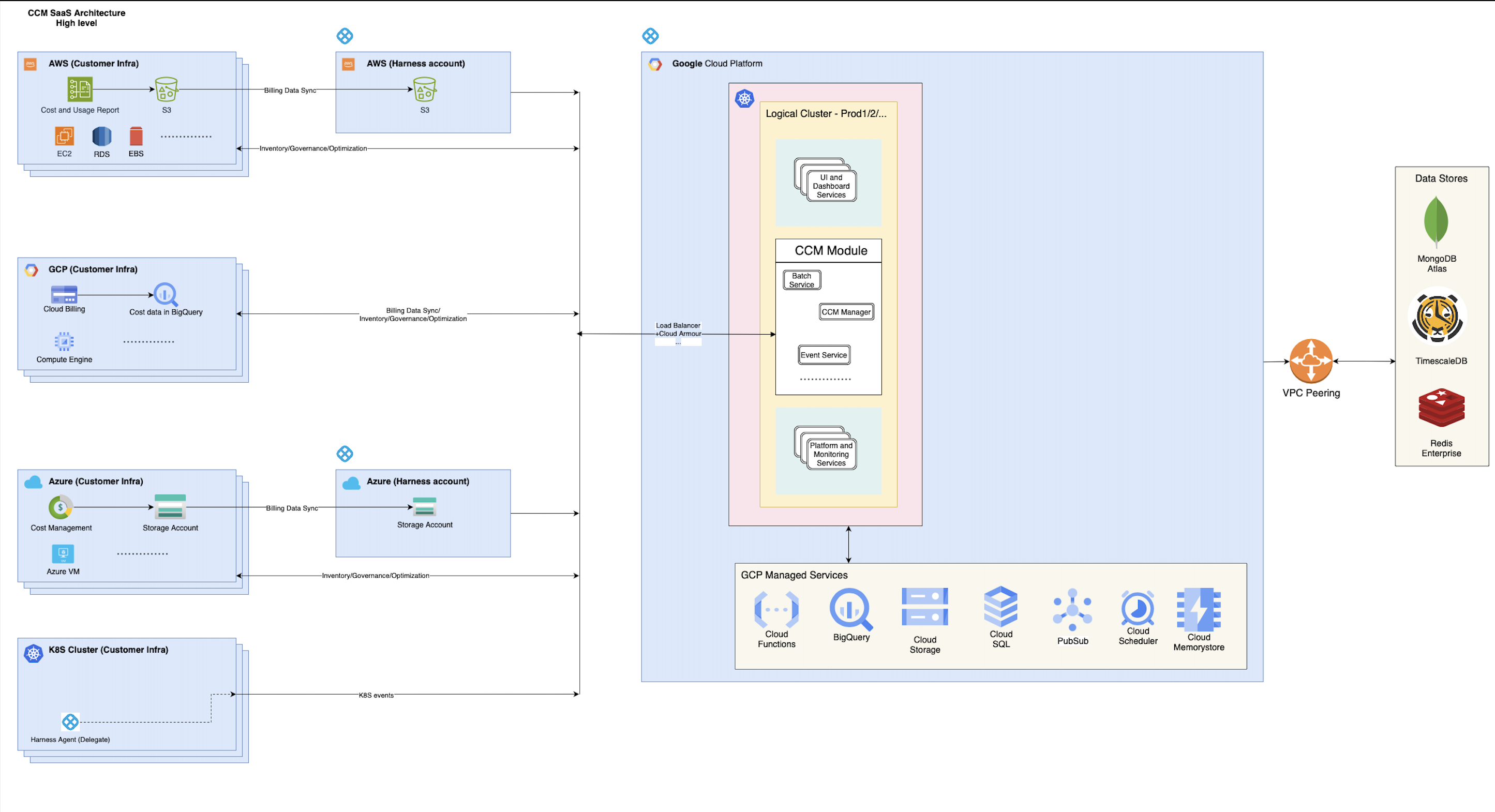 In this high-level overview of the CCM SaaS infrastructure, we delve into the inner workings of CCM as it performs crucial operations for cloud cost visibility and optimization across popular platforms such as K8S, AWS, GCP, and Azure.