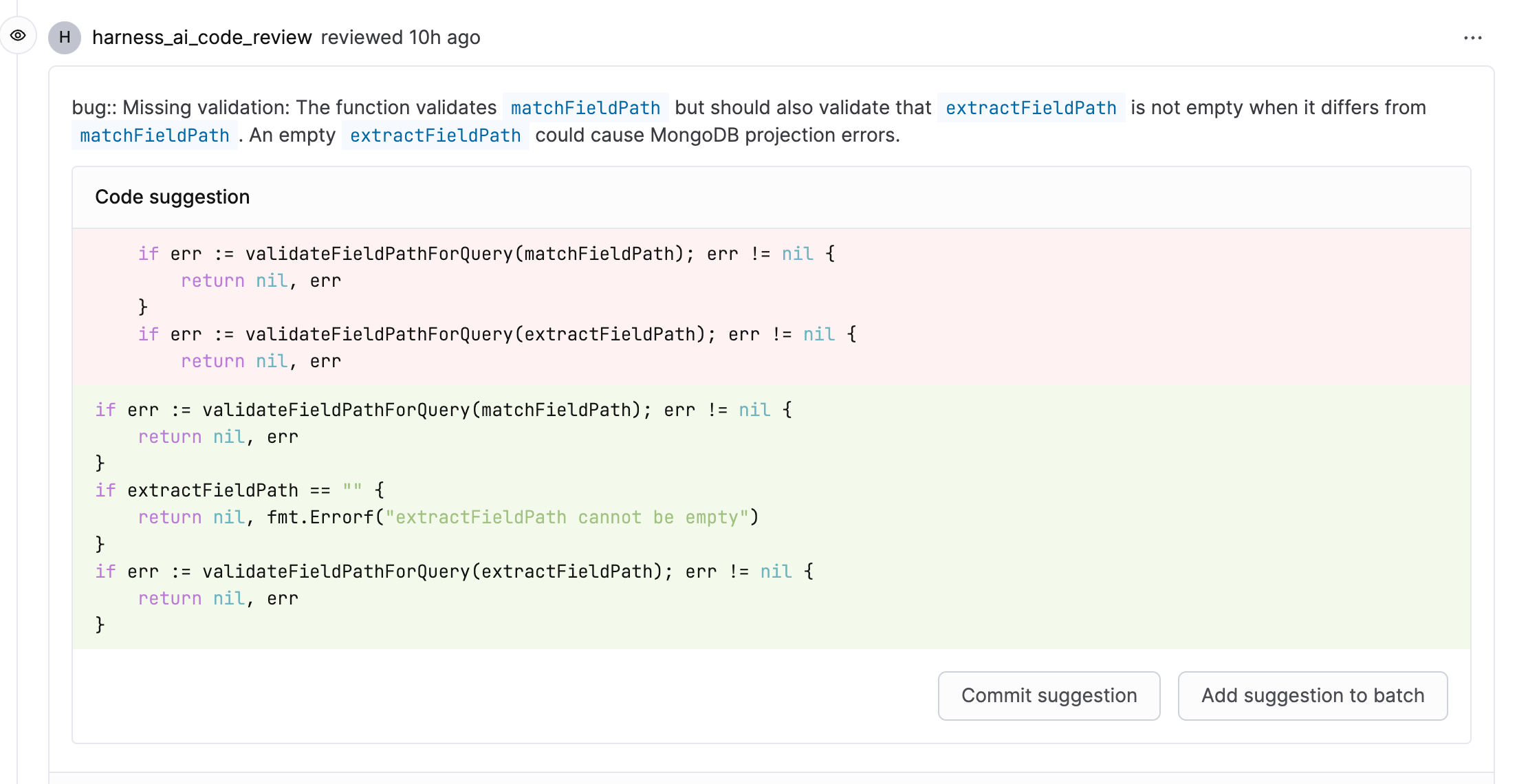 The Code Review Agent analyzes the pull request and automatically posts structured feedback directly on the PR. The feedback appears as review comments with explanations and suggested code changes that can be committed from the PR UI.