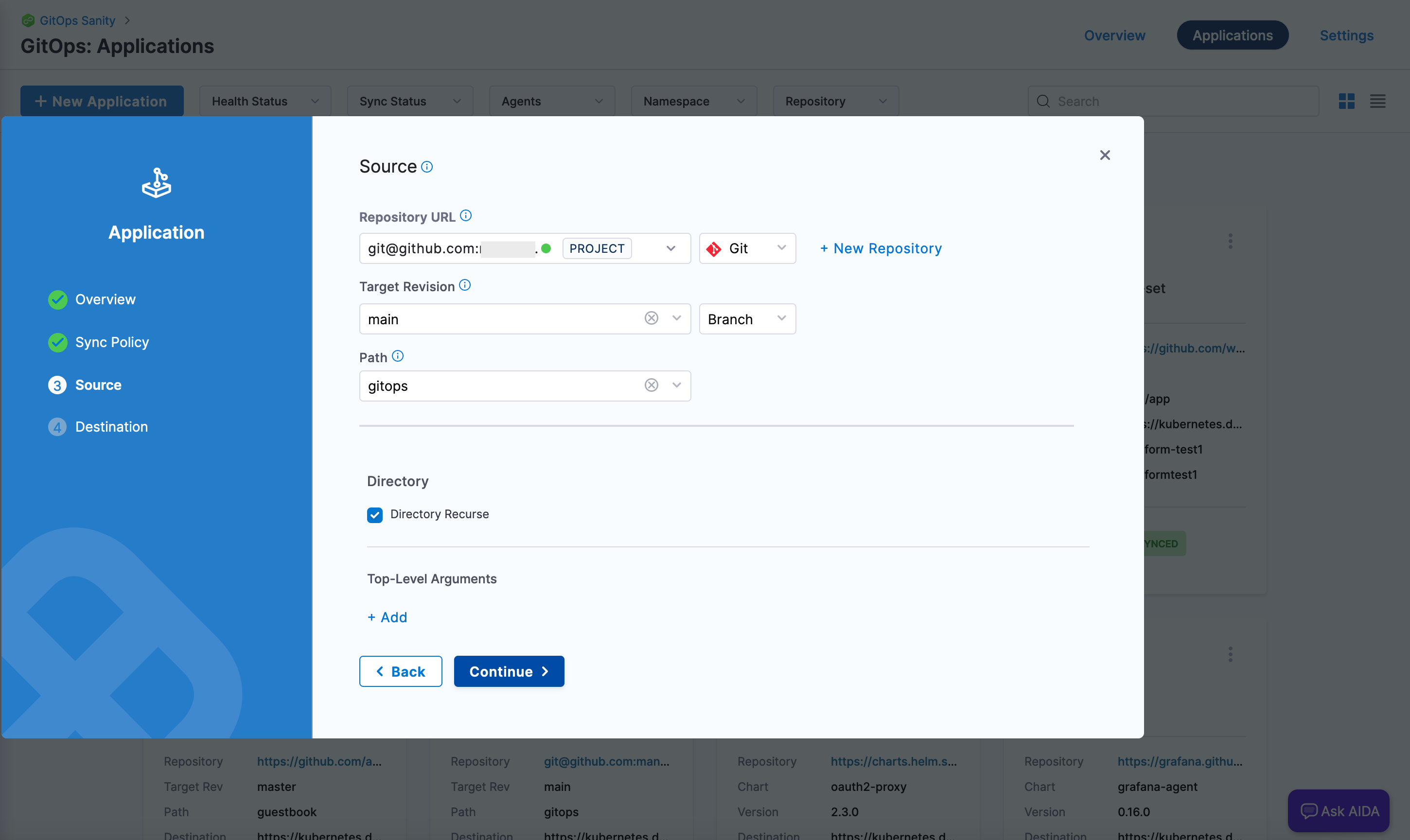 A Harness GitOps application consists of a GitOps repository, cluster, and application settings.