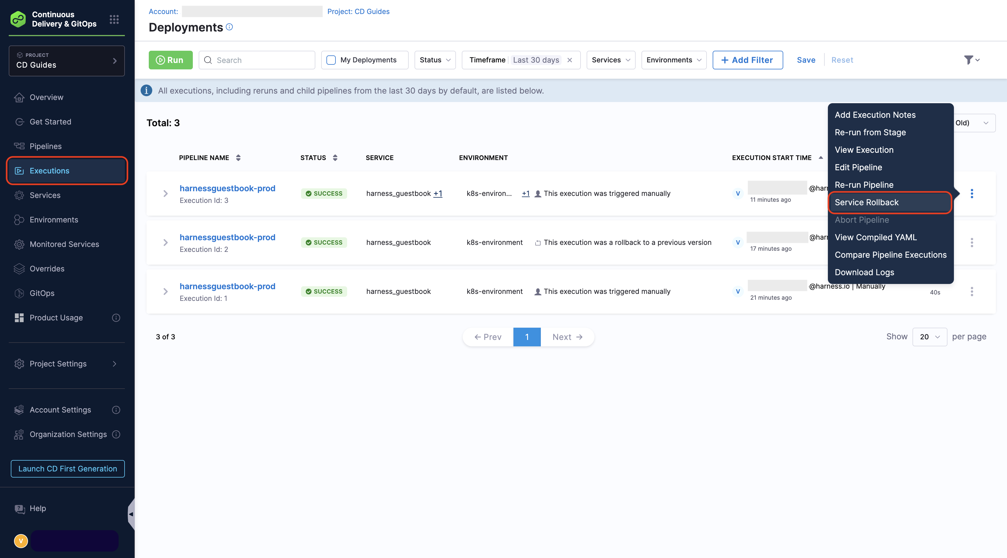 View all pipeline executions in a consolidated list format. The Rollback option is available for each successful deployment execution. Click the three dots menu to the left of the execution to access the rollback option.