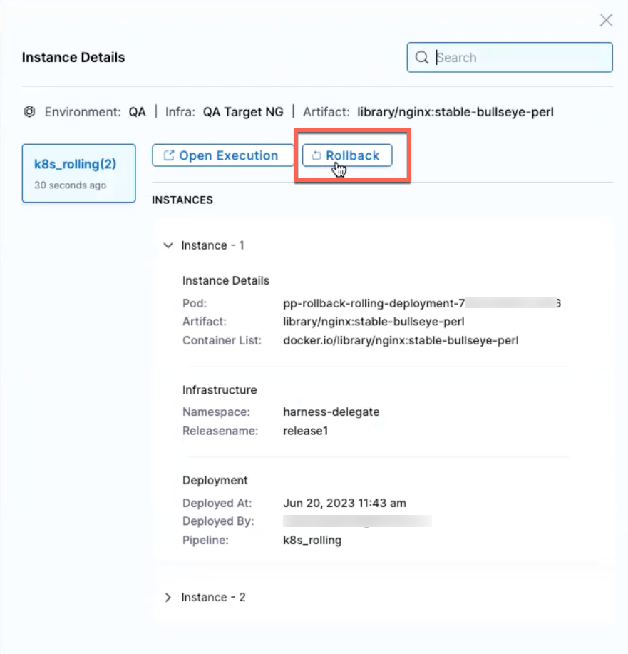 The Service Rollback feature provides a simplified and more intuitive way to initiate rollbacks directly from pipeline execution pages. Instead of navigating through instance details to find the rollback option, you can now start the rollback process with a clear, dedicated Rollback button.