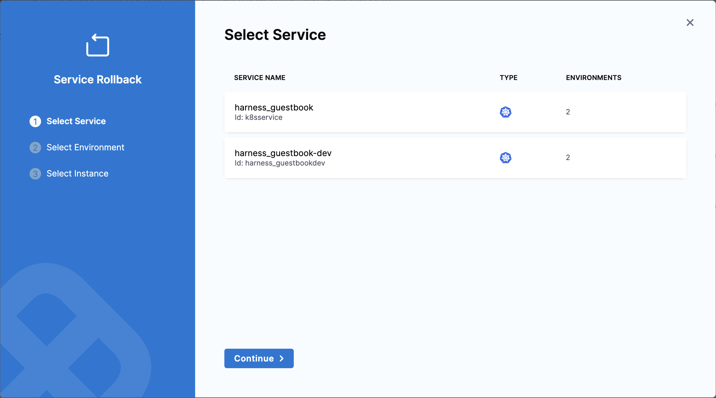Select Service Rollback from the menu options. A step wizard opens to guide you through the process.