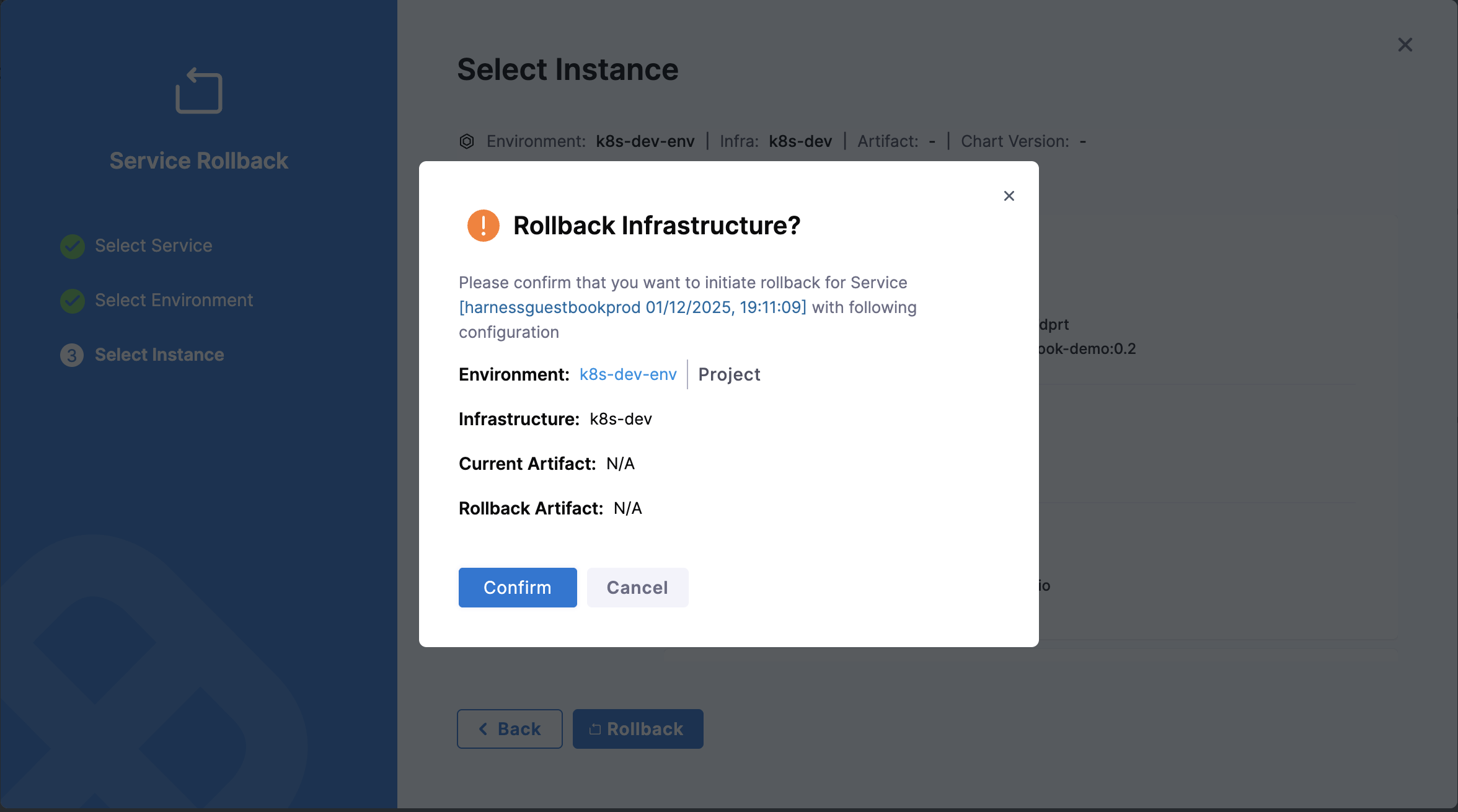 3. Select the deployment for which the rollback is to be performed, and click Confirm to initiate the rollback.
