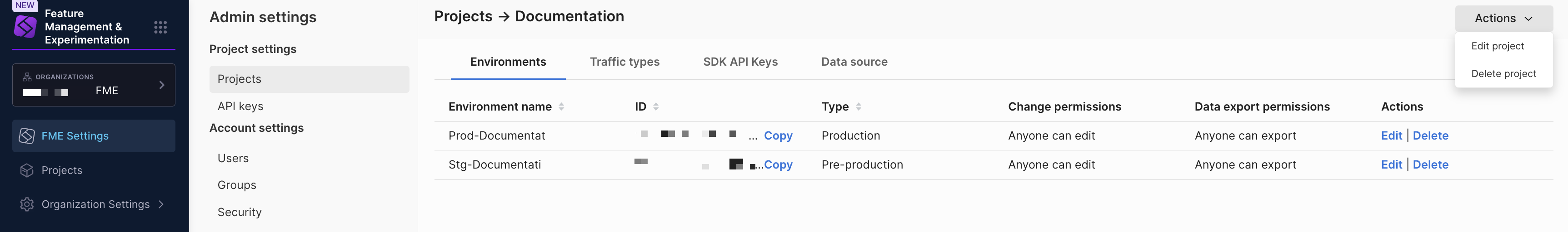 Select View on the desired project. From here, you can see the environment name, ID, type of project it is, permissions setting, and data export permission settings.