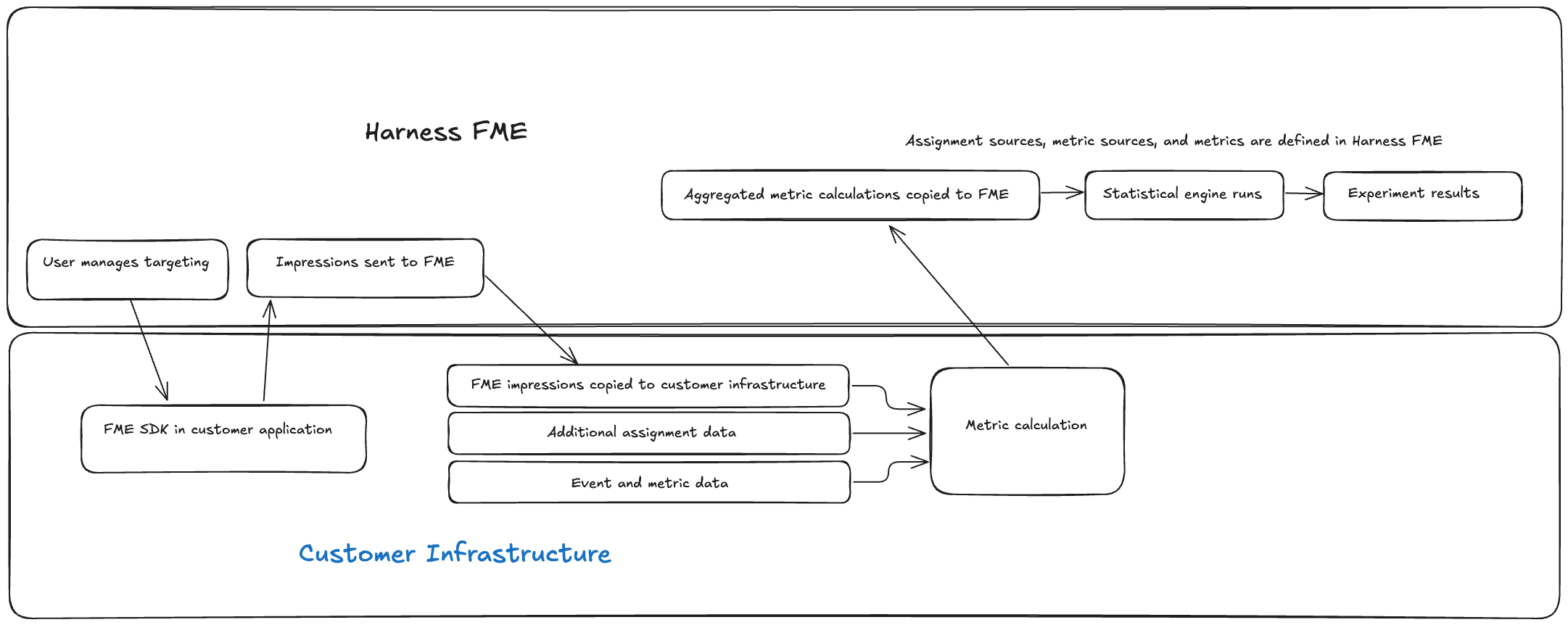 Cloud ExperimentsA method of running feature management experiments using a cloud-based service provided by Harness FME, which handles data collection, analysis, and reporting. are executed and analyzed within Harness FME, which collects feature flag impressions and performance data from your application and integrations. For more information, see the Cloud Experimentation documentation.