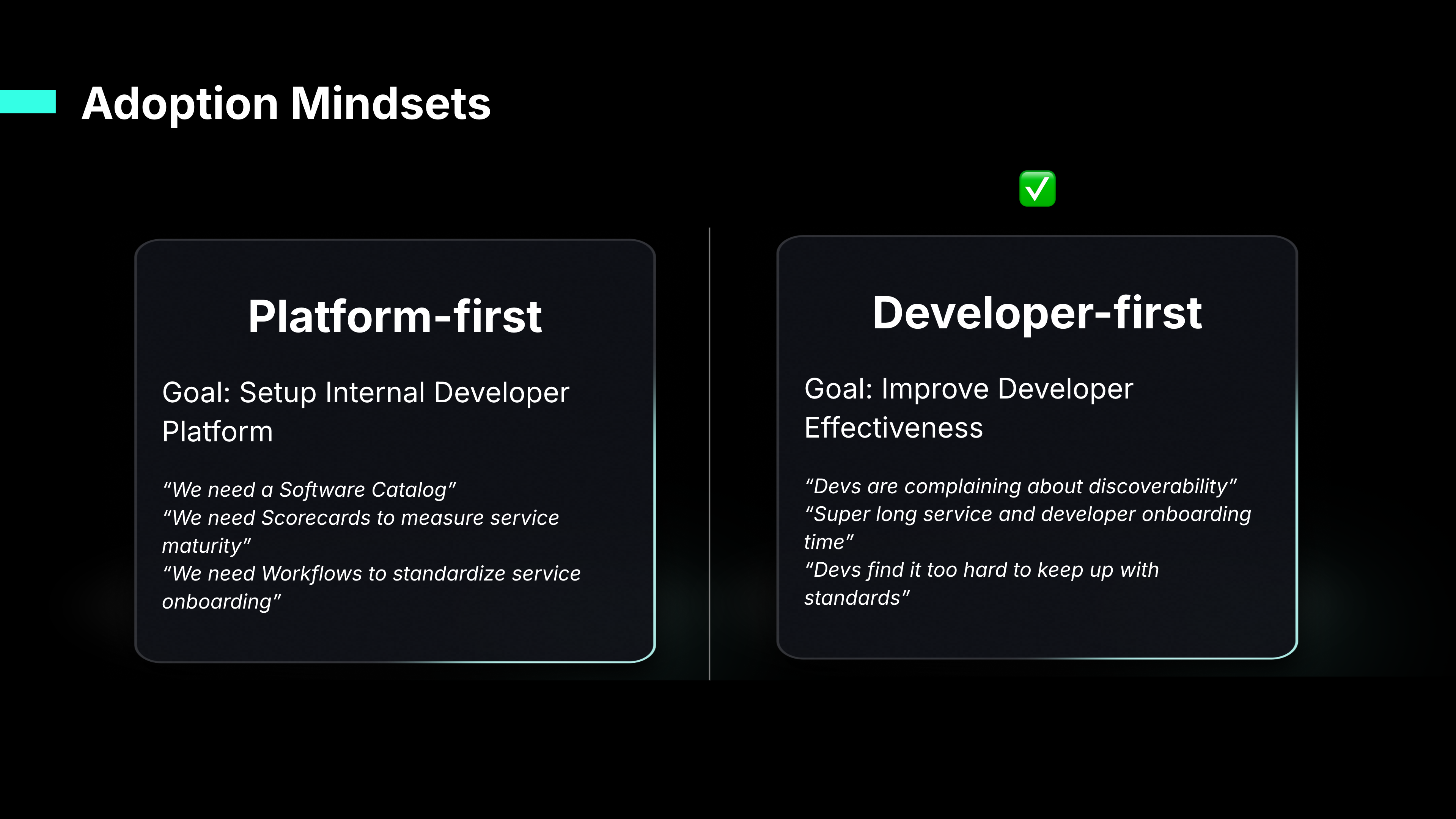 When it comes to adopting an Internal Developer Portal (IDP), organizations generally approach it with one of the two mindsets: the Platform-First Mindset or the Developer-First Mindset. While both have their merits, our research shows that a Developer-First Mindset leads to significantly higher adoption success.