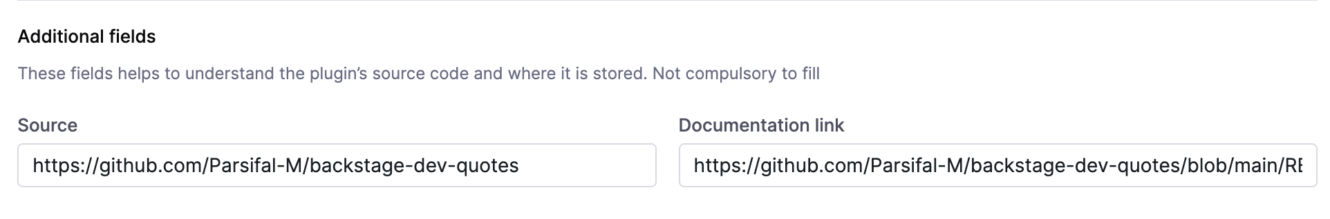 • Package name : This will be same as your plugin package present in your plugin's package.json file. Make sure the name is exactly similar to what's mentioned in the package.json including @, e.g.: @parsifal-m/plugin-dev-quotes-homepage