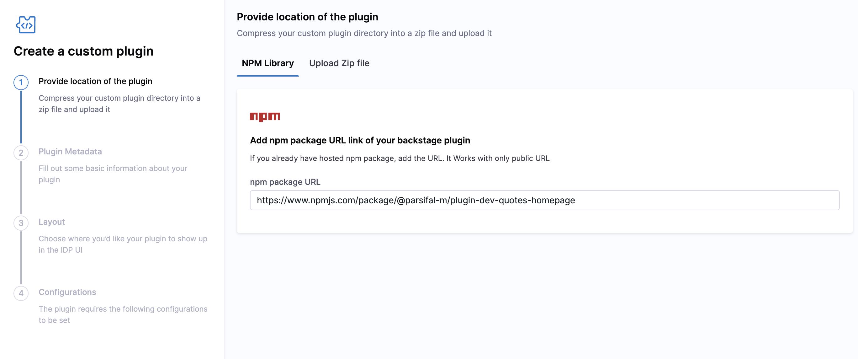1. Now add the URL for your plugin public npm package.