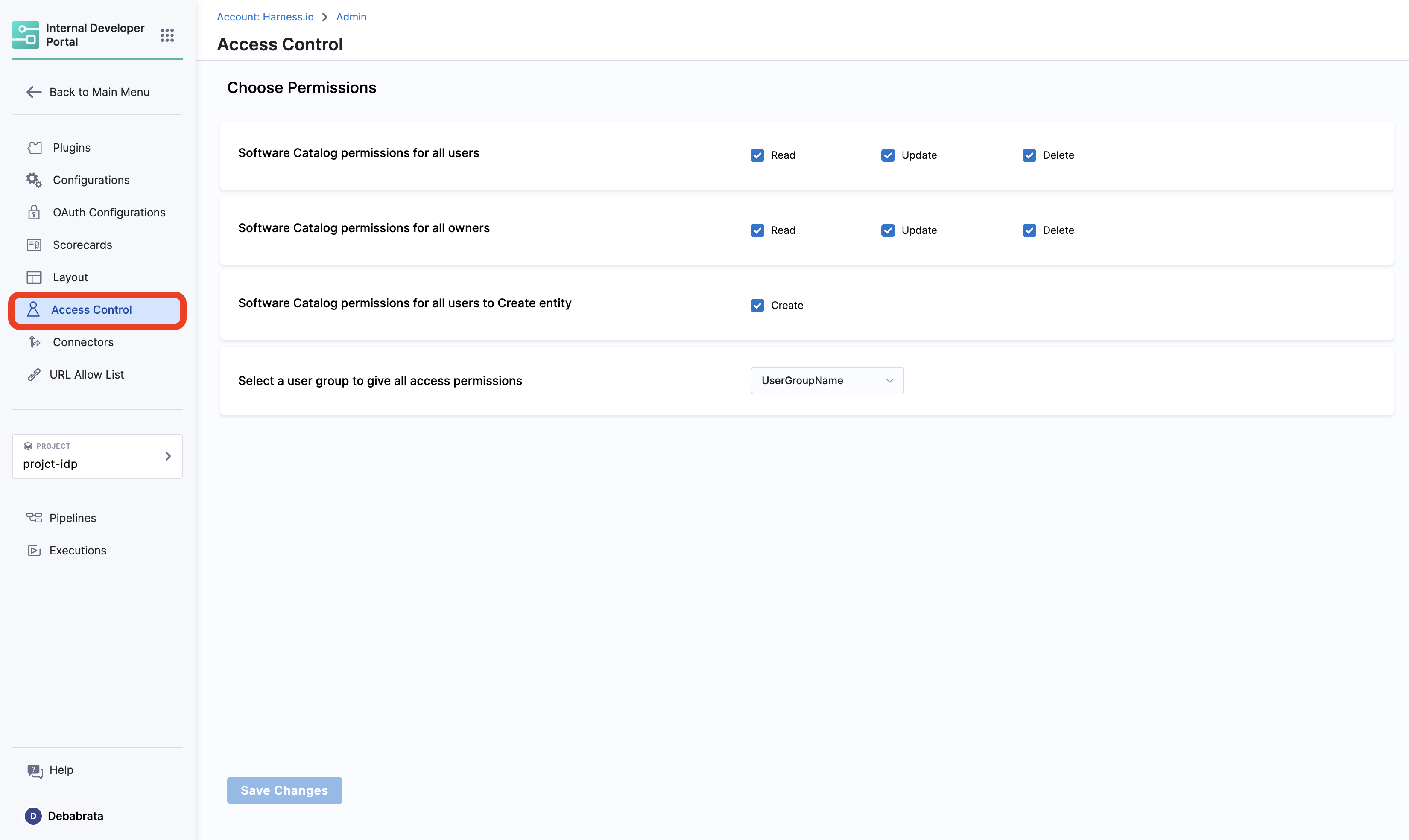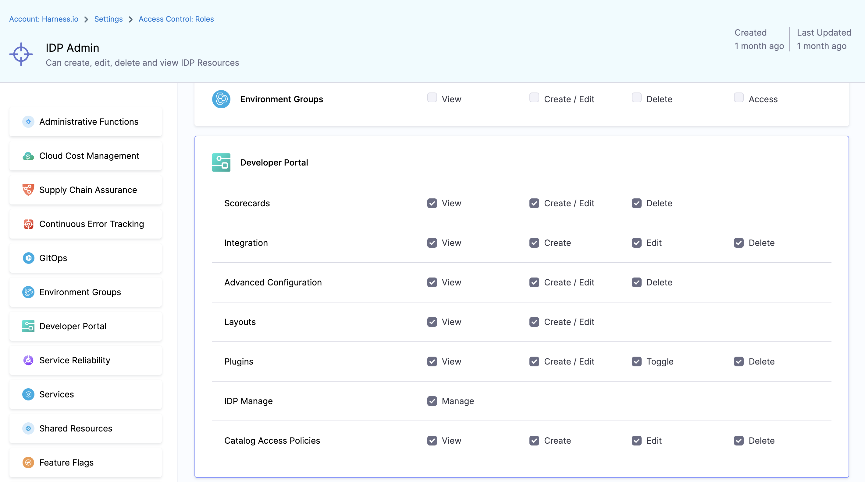 All IDP resources can exist at different scopes, but their permissions and access levels depend on the RBAC settings you apply. With granular RBAC, you can use predefined roles or define custom roles with specific permissions and organize them into reusable resource groups. These permissions are fully aligned with the existing Harness RBAC framework.