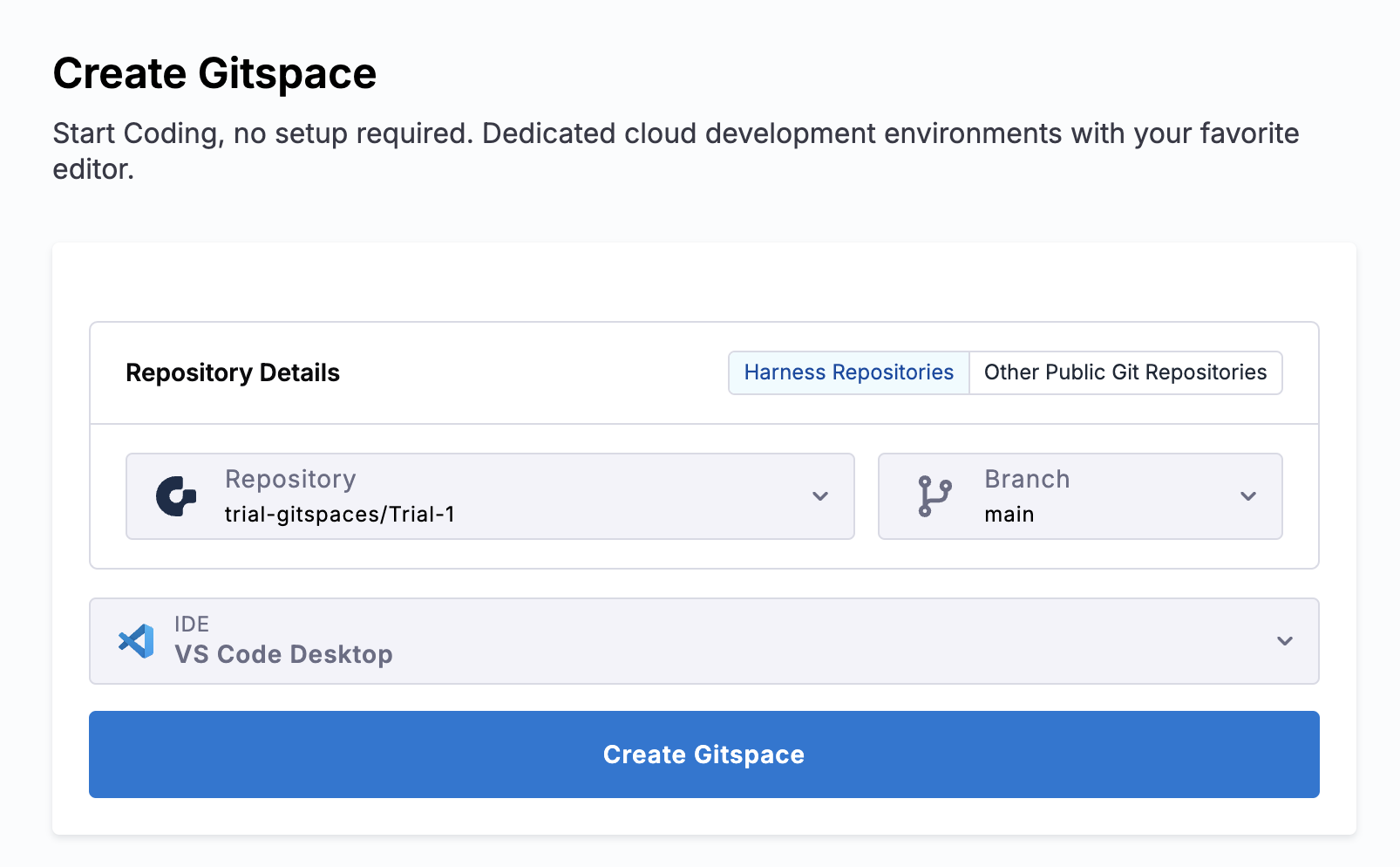 Start by creating a Gitspace in your Harness Open Source UI.