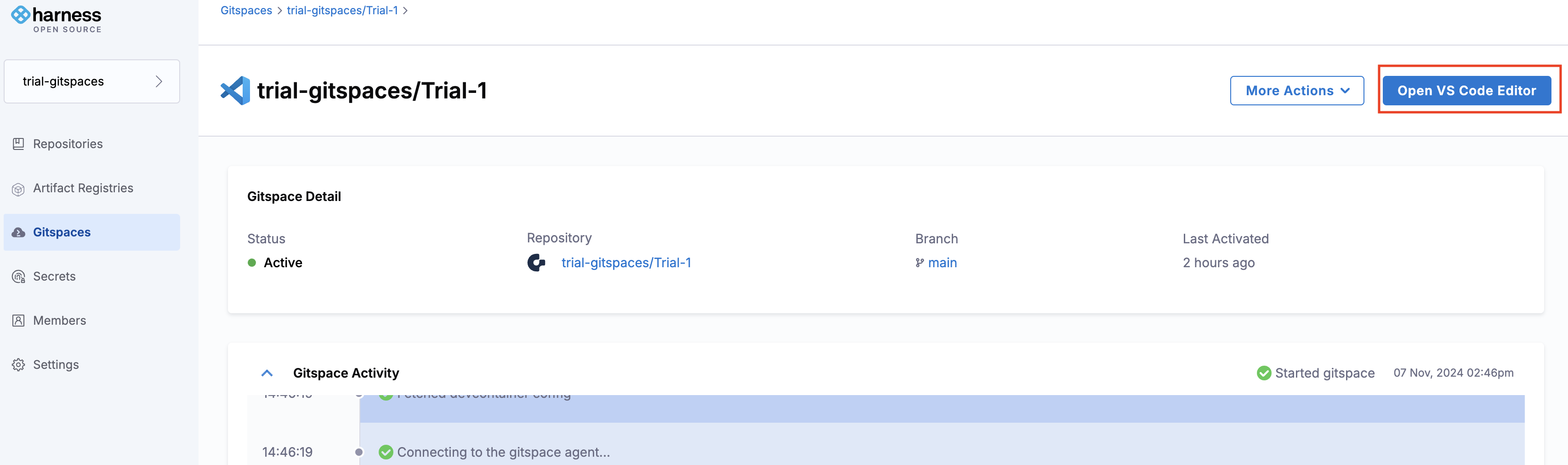 After the Gitspace is created, click "Open VS Code Editor" from the Harness Open Source UI.