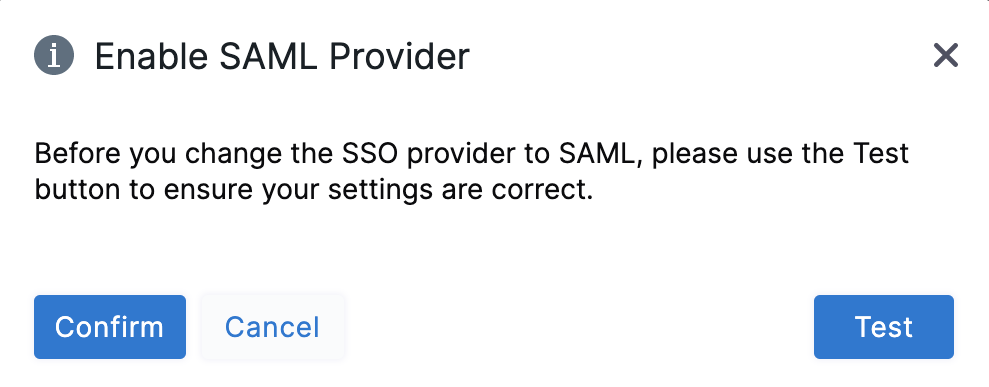3. On the Enable SAML Provider confirmation window, select Test to verify the connection. A new browser tab opens where you need to log in to Okta.