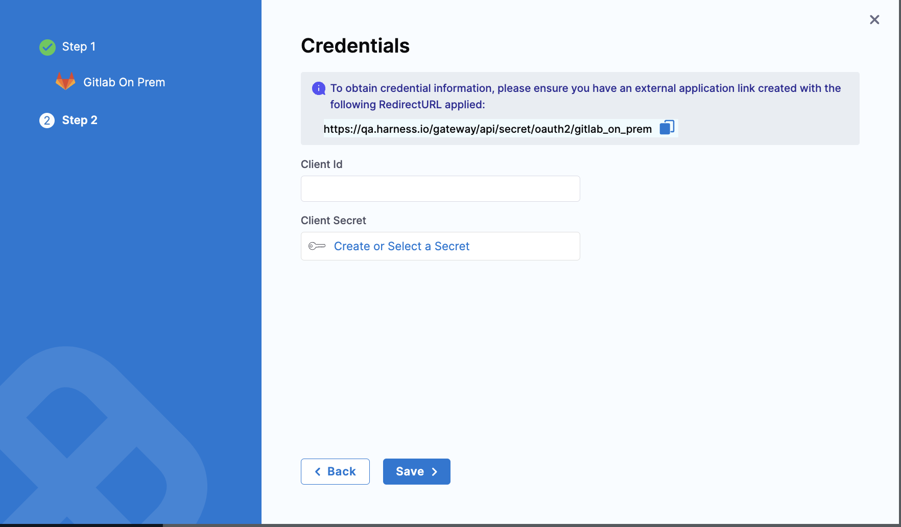 Copy the Redirect URL provided on the Harness Credentials page.