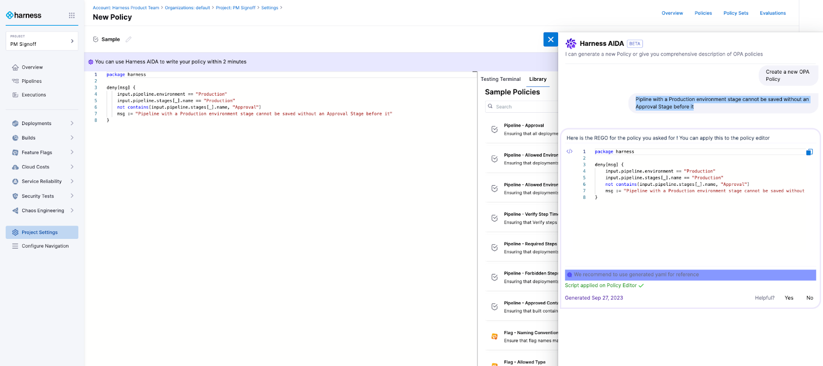 Create OPA Policies: Harness AI helps you get started and write OPA Policies based on pipelines, connectors, and templates, and other Harness objects with no need to understand the nuances of REGO (Open Policy Agent language).