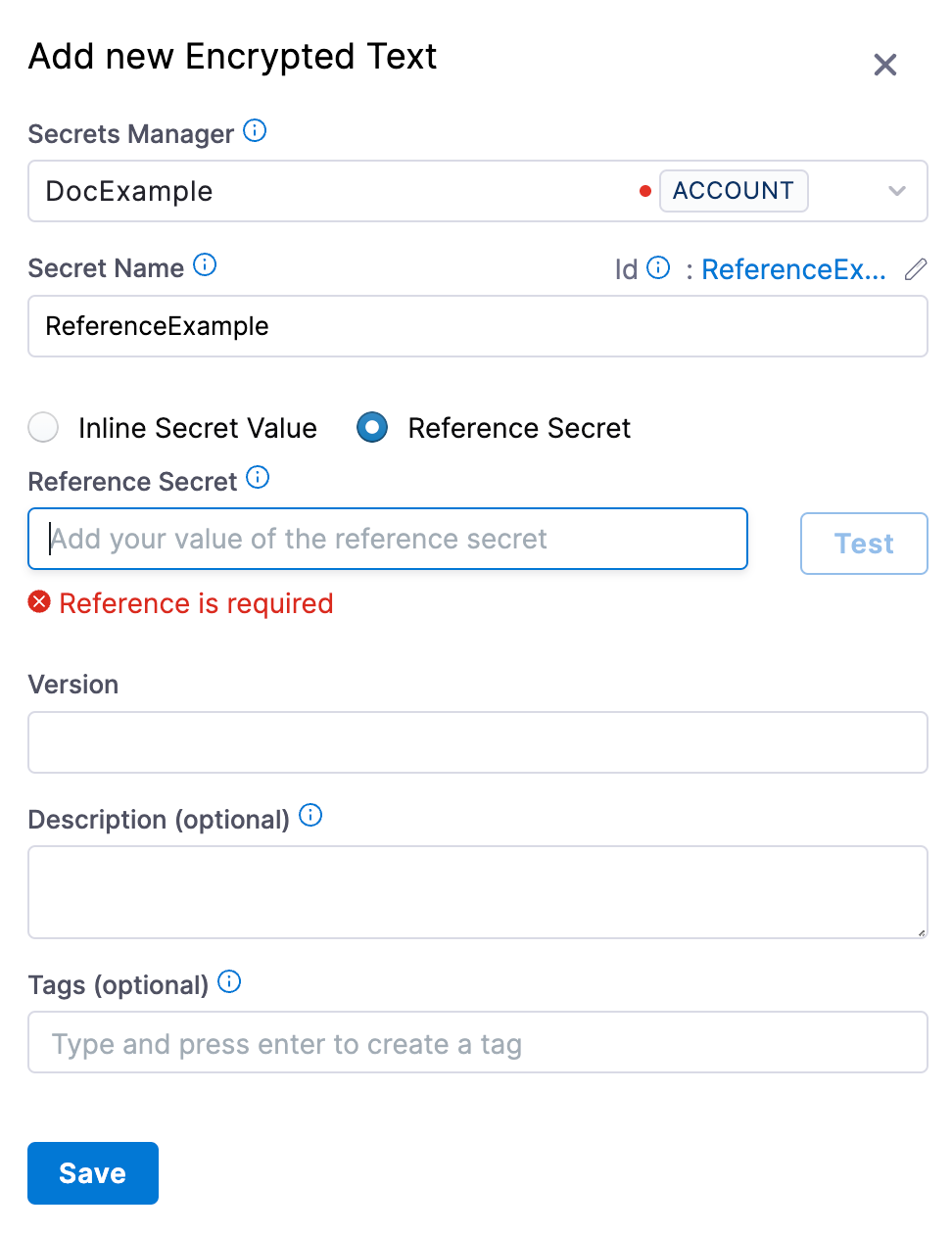 • When creating or referencing secrets (inline text, reference, or encrypted file), you can optionally specify a Project field.