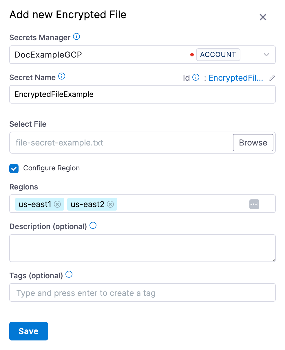 7. In Google Secrets Manager Credentials File, select the encrypted file you just added in Harness.