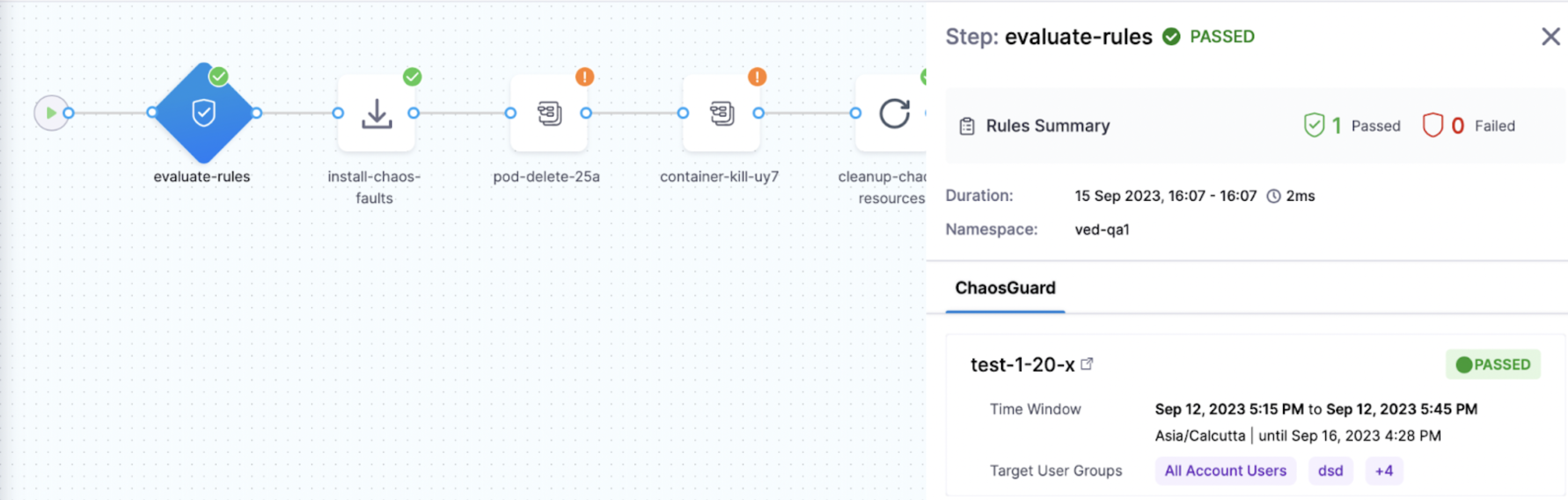 Below is a snap that shows a successful evaluation of all the rules in a chaos experiment.