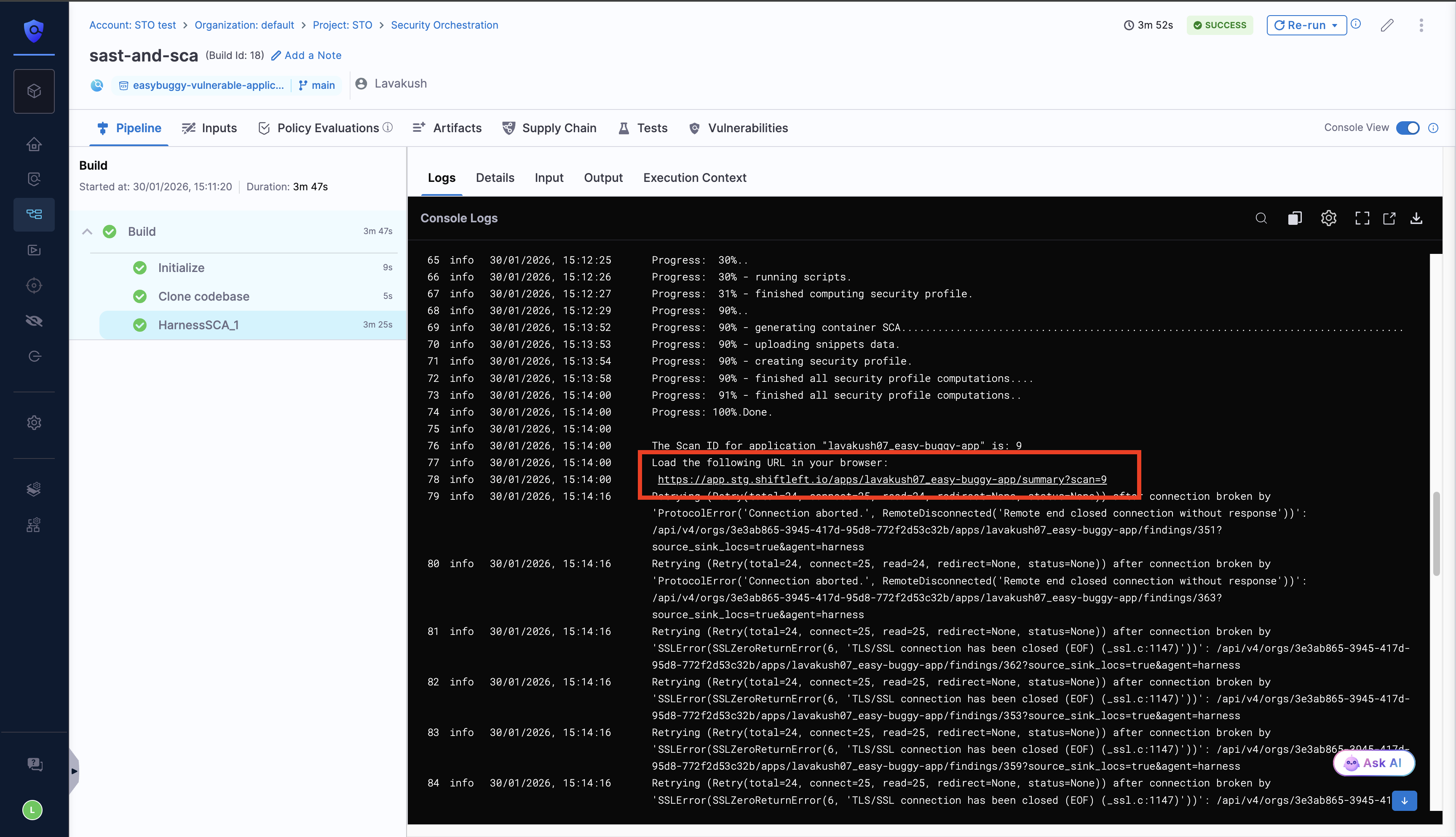 After you complete the pipeline run with the Harness SCA scanner, in the scan logs, you can click the provided shiftleftlink, which redirects you to the Qwiet AI dashboard, where you can explore detailed scan results and analyze identified issues.