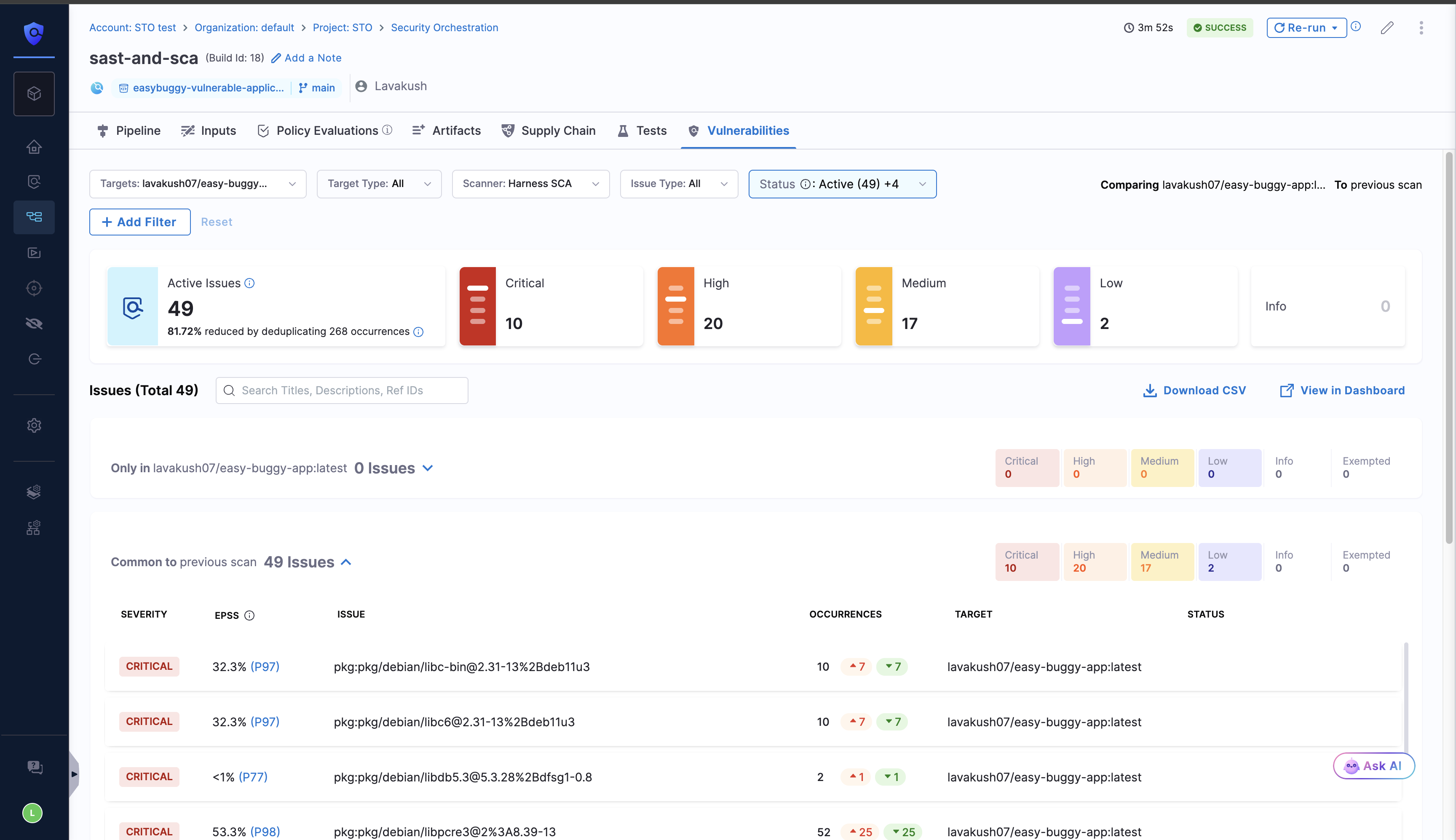The SCA step works natively within STO, with all findings unified and visible alongside results from other security scanners.