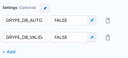 GRYPE_DB_AUTO_UPDATE=FALSEDisables downloading a new database.GRYPE_DB_VALIDATE_AGE=FALSEDisables the staleness check for the database.