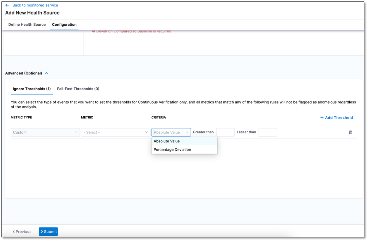 Ignore Threshold: Instructs Harness to skip analyzing service health for specific metric or value combinations.