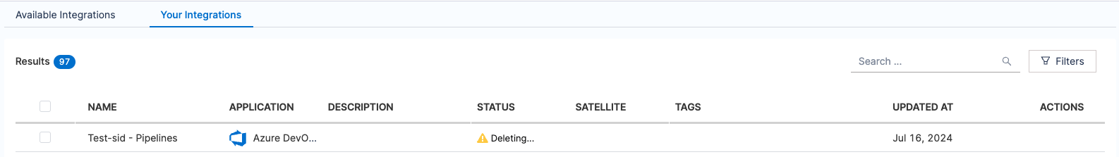 The integration status will change to Deleting. The deletion process is scheduled, and once complete, the integration will no longer be listed in the Available Integrations tab.