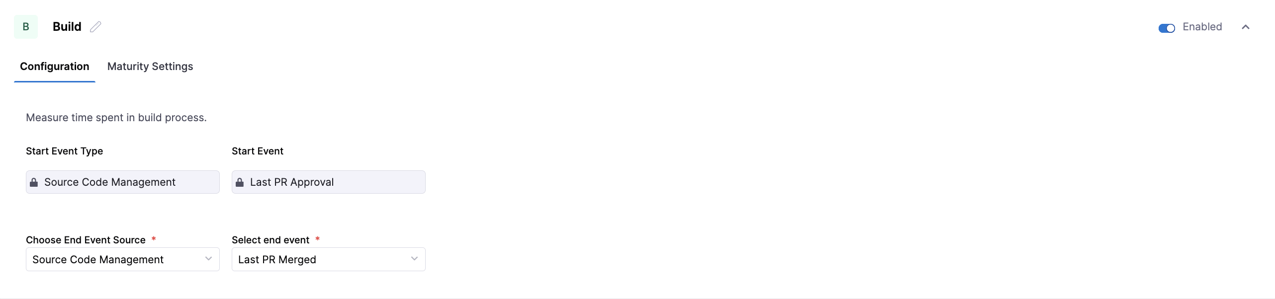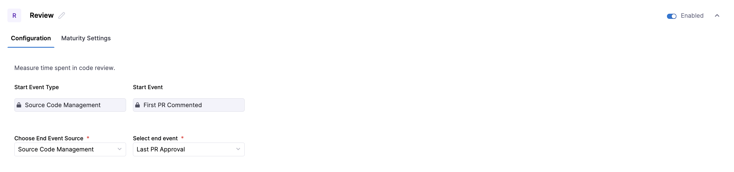 | End Event | The signal that marks completion of the stage. | Last PR Merged Last PR Approval |