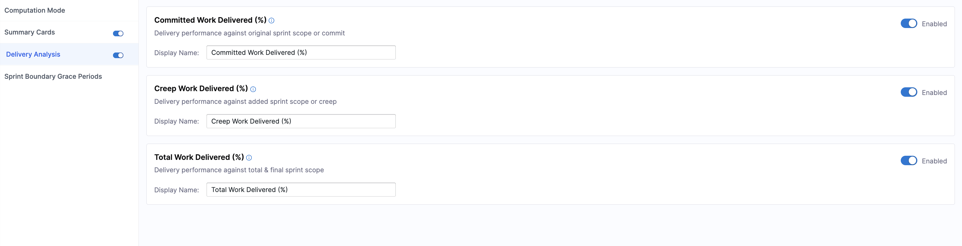 Delivery Analysis controls how sprint delivery performance is evaluated.