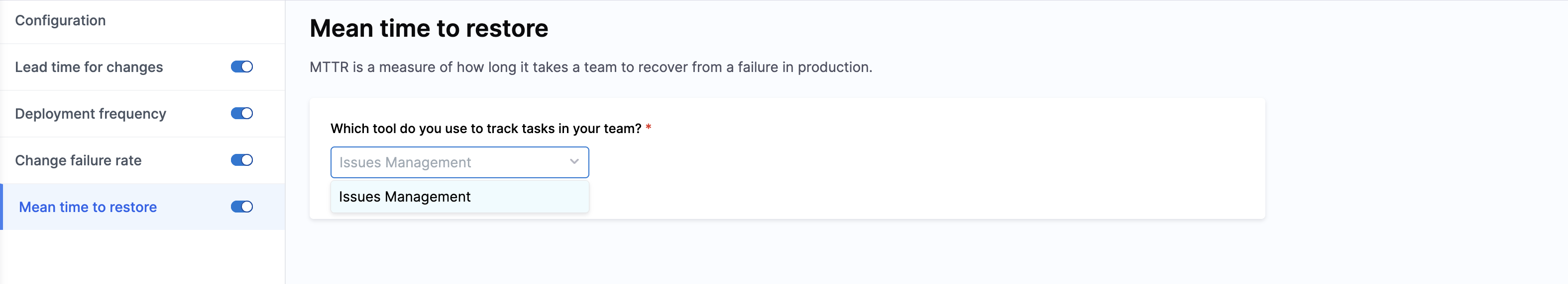- Issue Management (e.g., Jira): SEI counts incidents or issues tracked in your Issue Management system that mark service downtime or failures. Selecting this enables Harness SEI to measure Mean Time to Restore based on issue resolution events.