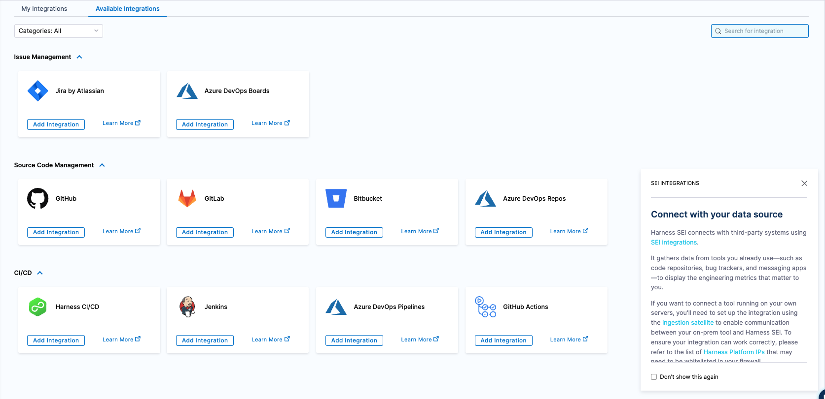 To start using SEI 2.0, you can configure integrations with your organization's source control, CI/CD, and ticketing tools.