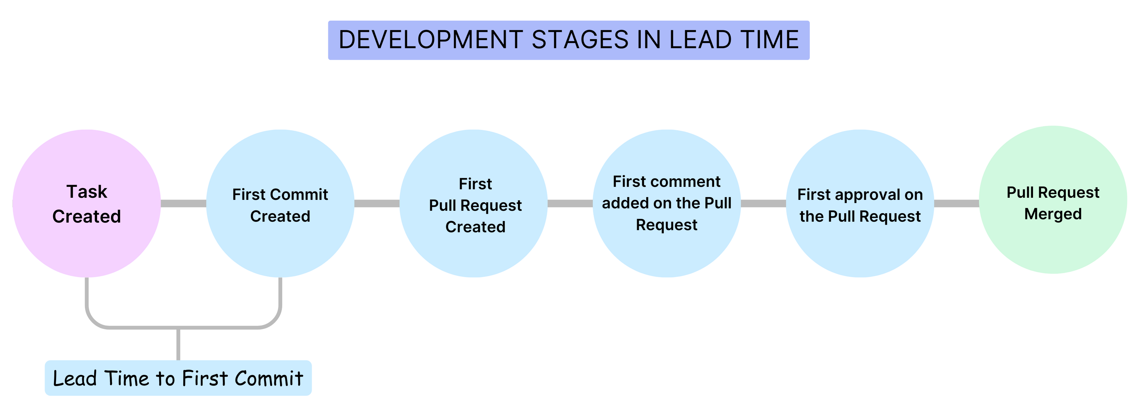 The specific events or stages considered in a lead time calculation depend on the report and the stages defined in the associated [Workflow profile]/docs/software-engineering-insights/propelo-sei/setup-sei/sei-profiles/workflow-profiles/velocity-profile). The lead time ultimately depends on the stages that a PR or issue actually goes through. For example, if there are no comments on the a, then the time to comment is zero.