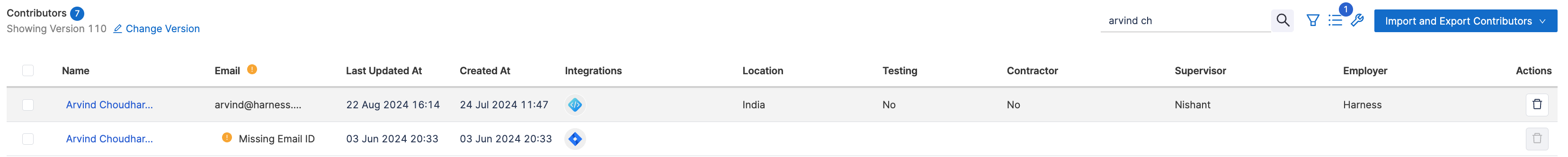 - Identify the duplicate contributor profiles. For example: A contributor with the Harness Code integration and an associated email and the same contributor with the Jira integration but without an associated email.
