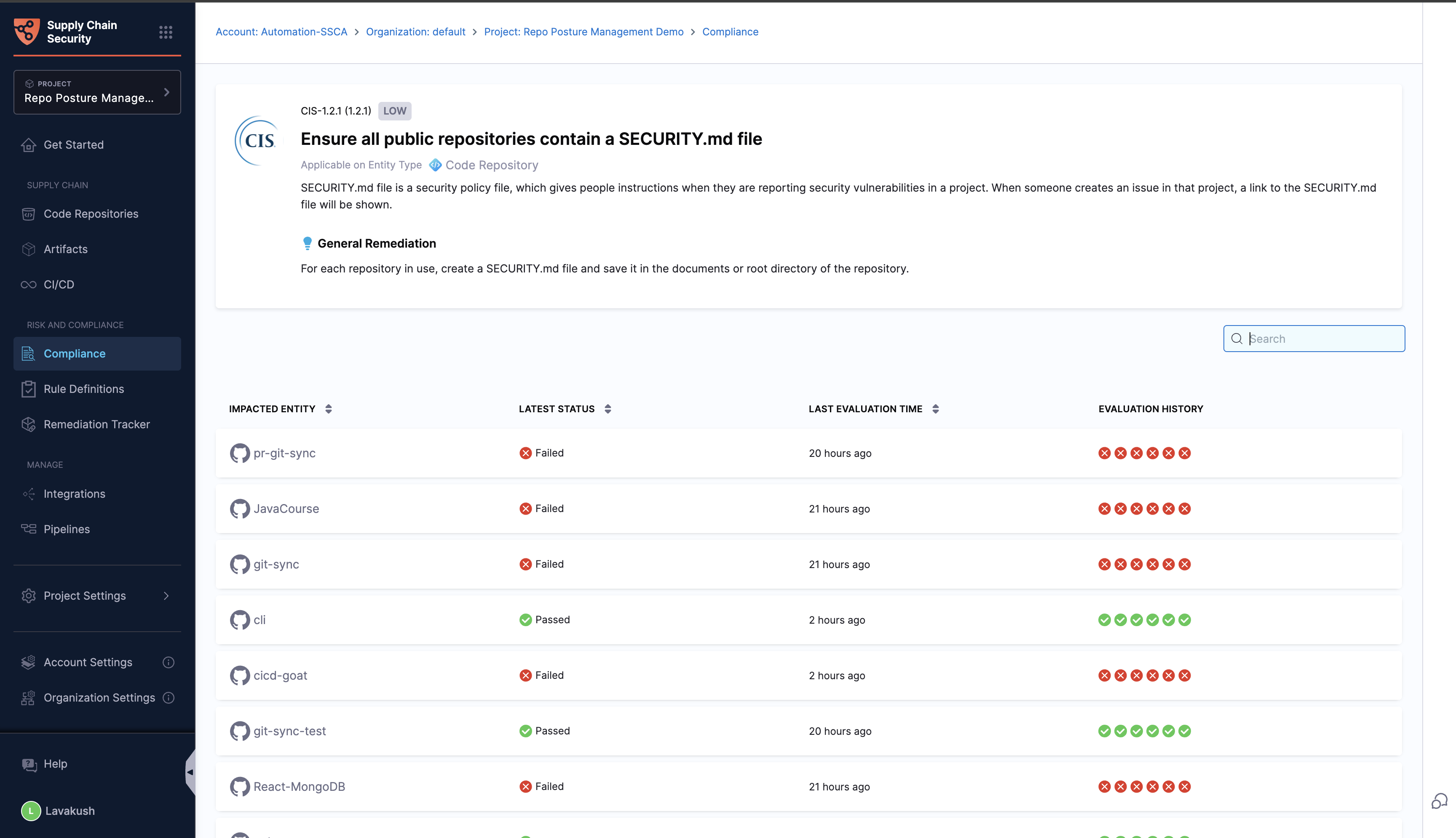 The Compliance section within the SCS module serves as a hub for assessing and understanding the risk posture of your entire supply chain. This section is indispensable for GRC (Governance, Risk, and Compliance) and security teams as it provides detailed evaluation results after applying all relevant rules to various target types within your supply chain. You can access a thorough summary of these evaluations, including the specific rules applied, their execution statuses, and the target types impacted by each rule.